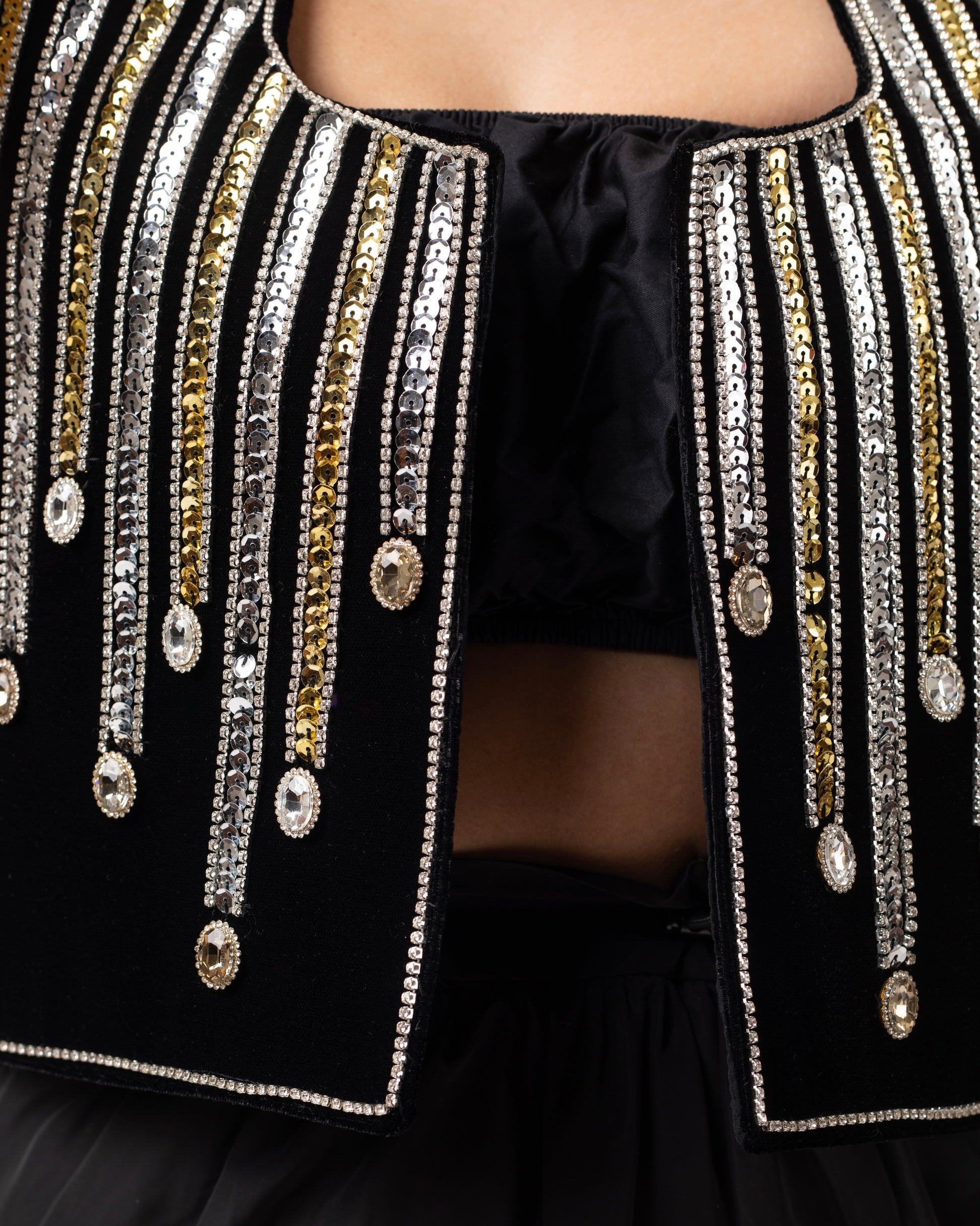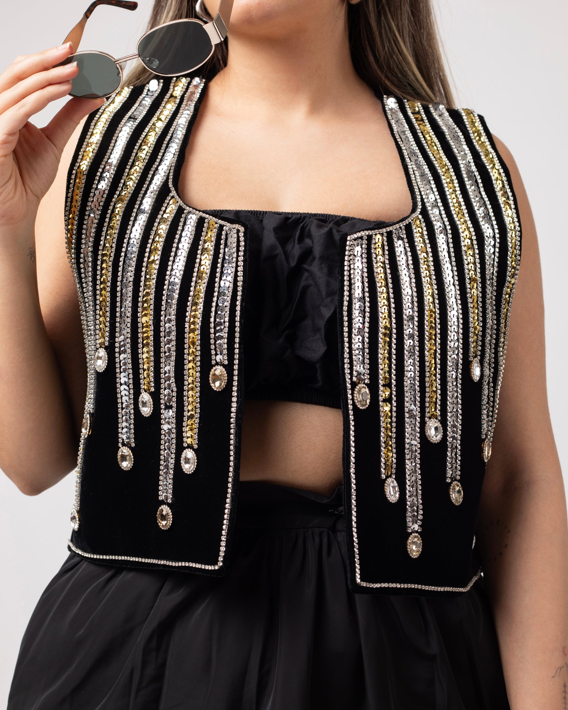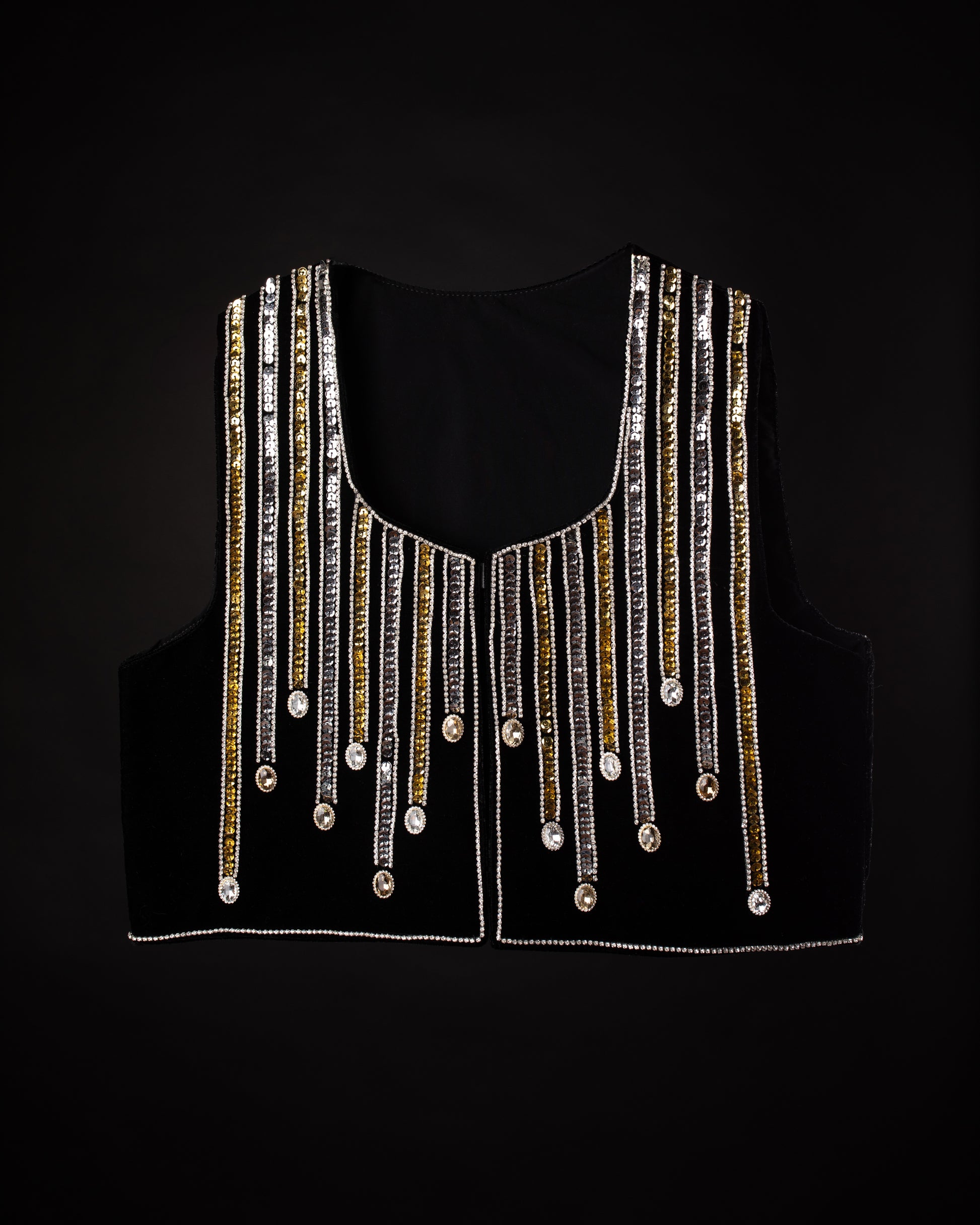 Defined by cascading rows of gold and silver sequins, this vest captures the beauty of falling rain illuminated by streetlights. It's a shimmering, contemporary statement piece ideal for sophisticated evenings.