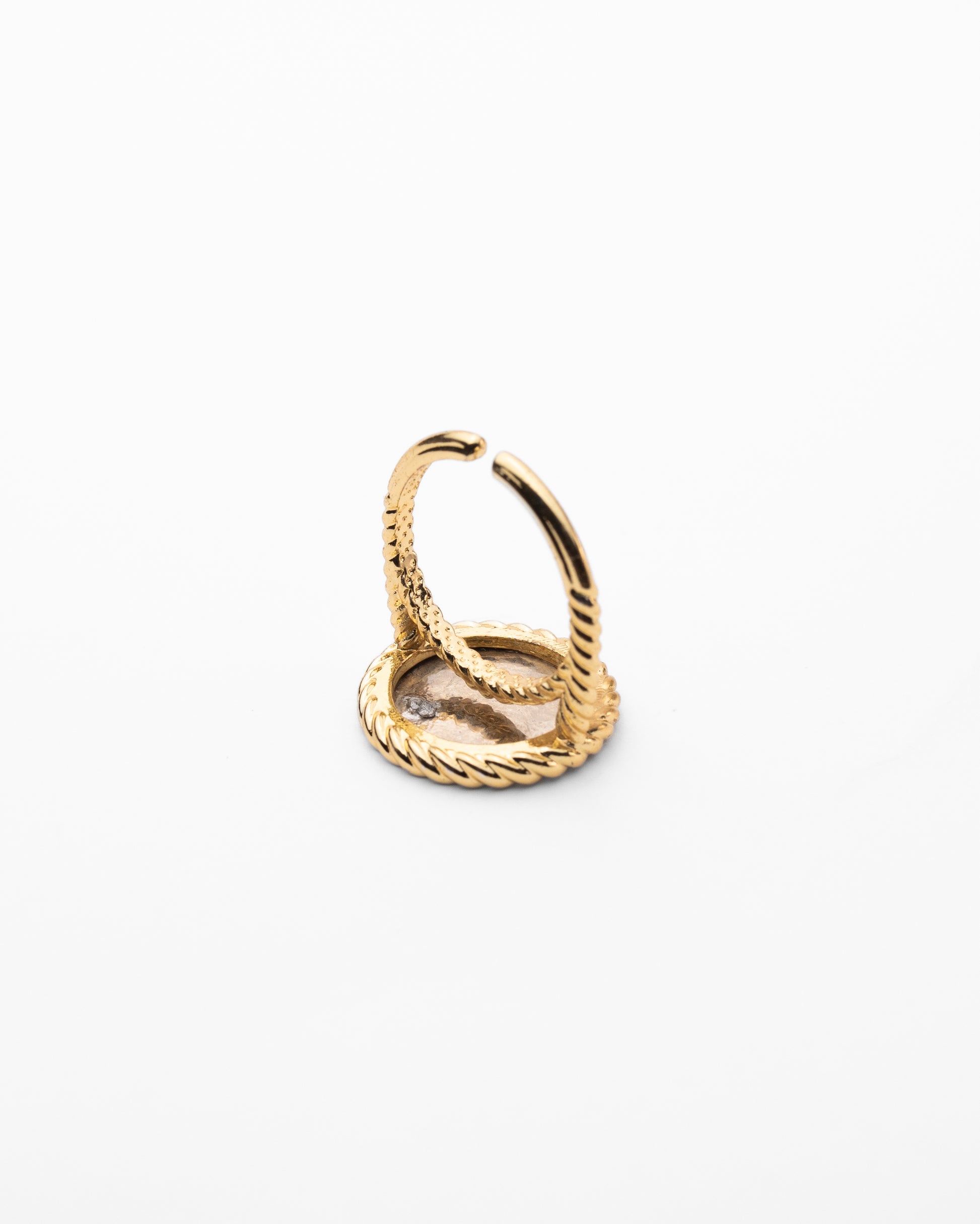 A lovely ring featuring a delicate, sunburst engraved centerpiece symbolizing vitality, radiance, and positivity.