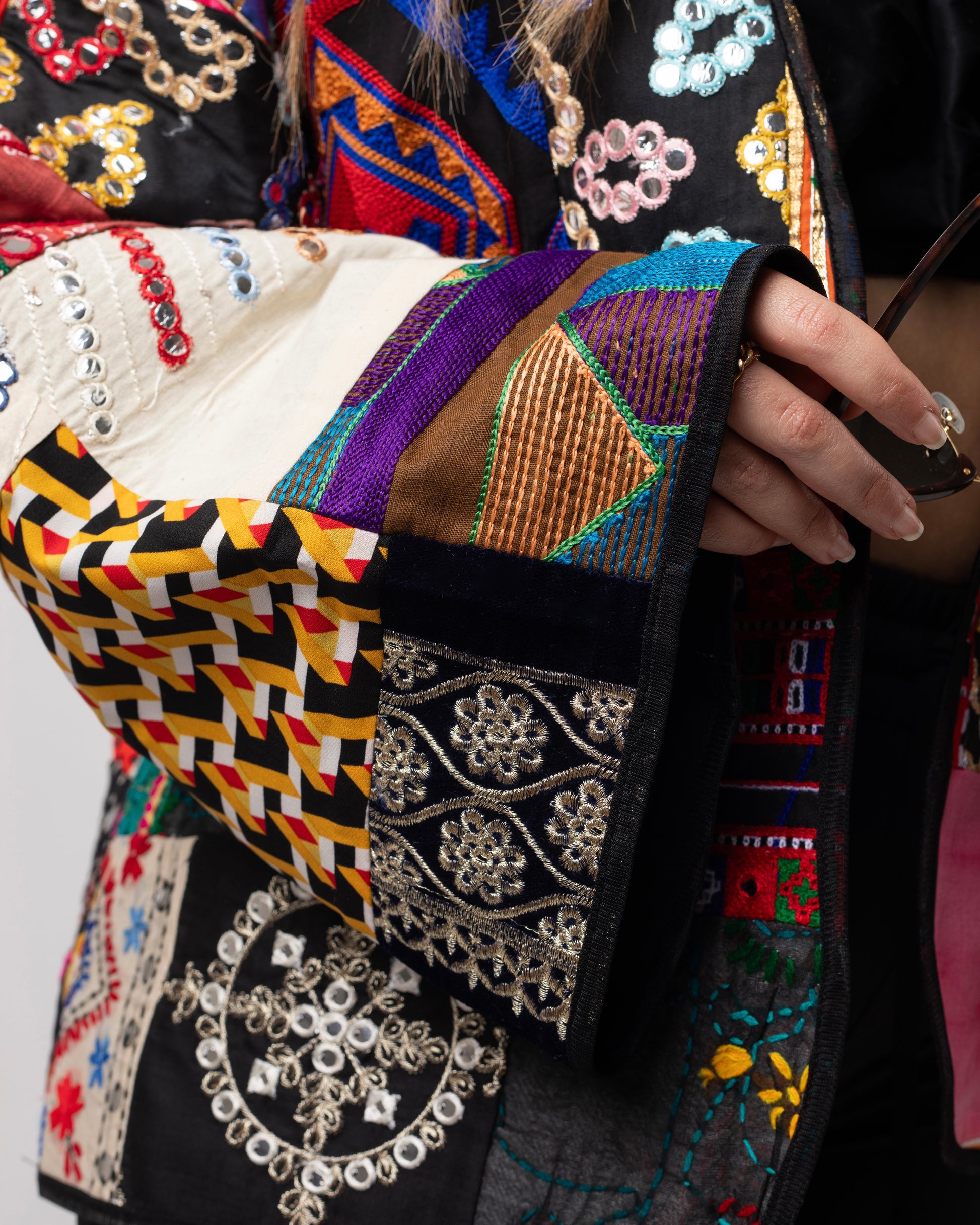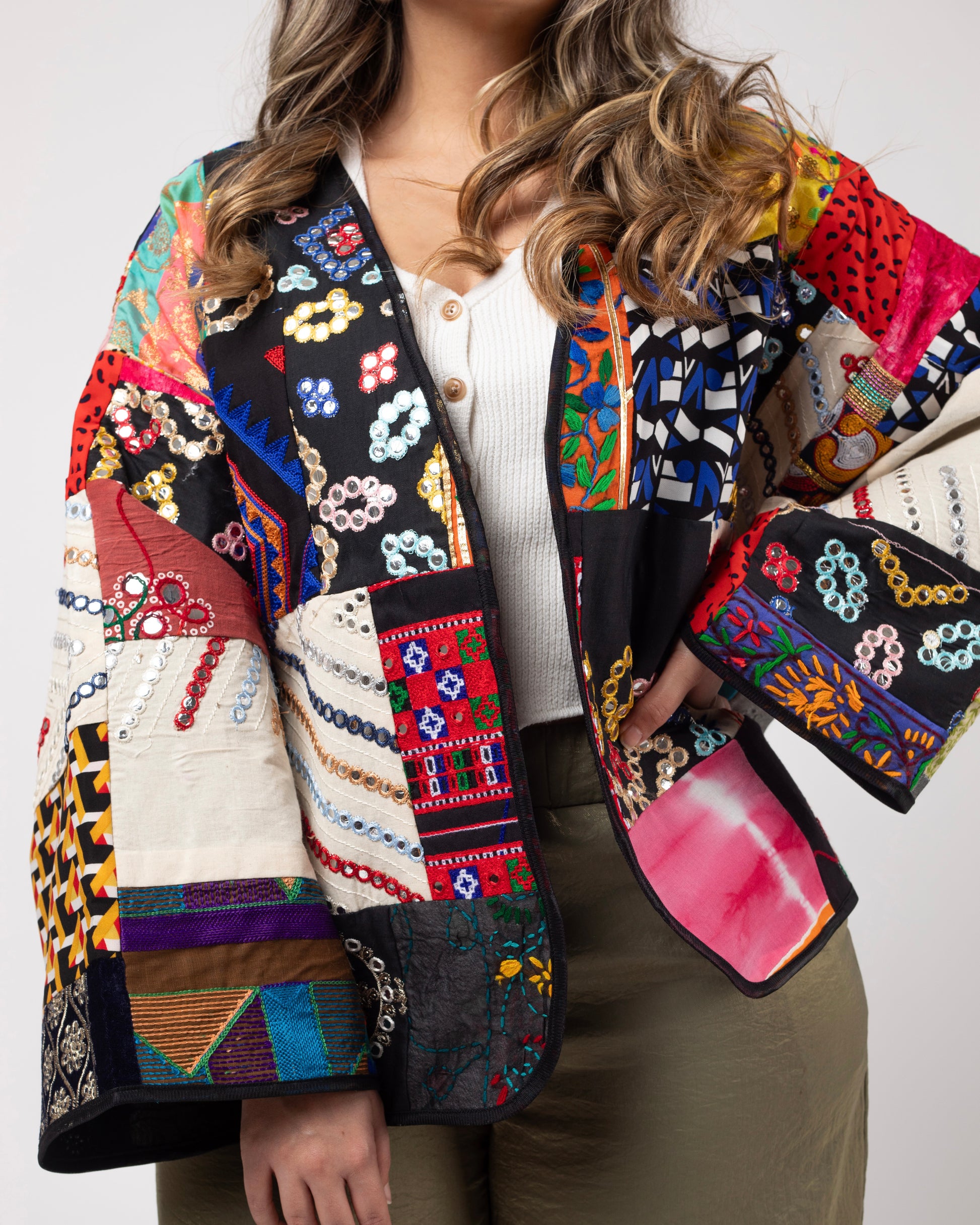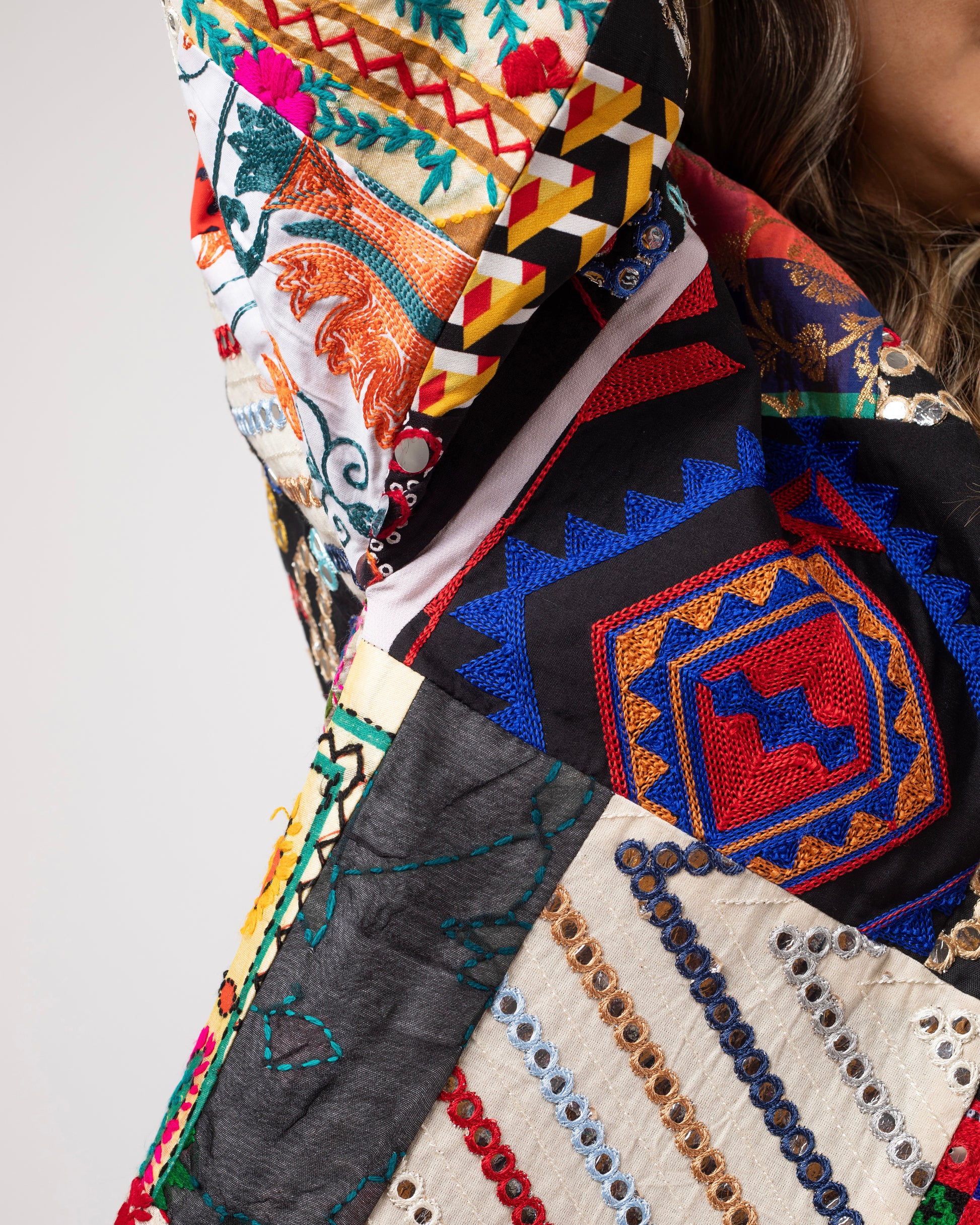 A mosaic of mirror-work, florals, symbols, and tribal geometry — Mehrbanoo is regal chaos made wearable. The bold patchwork speaks of stories stitched together through time, while the open cut keeps the silhouette airy and grounded.