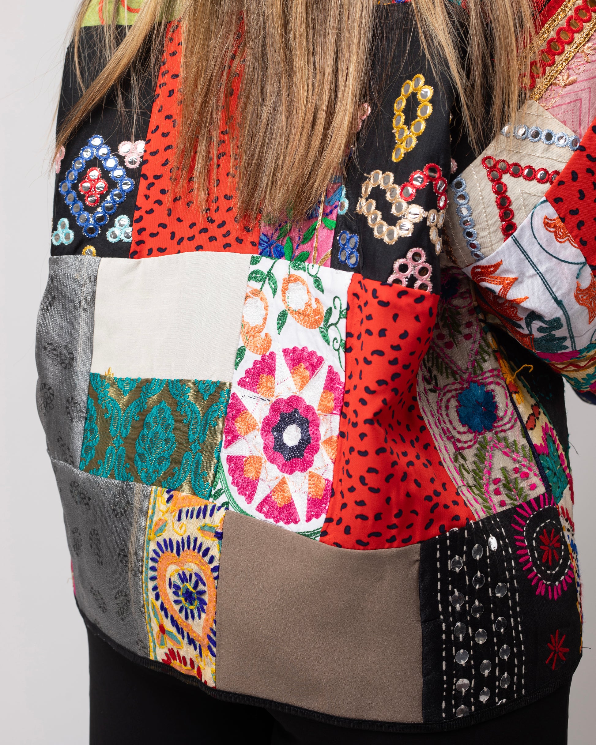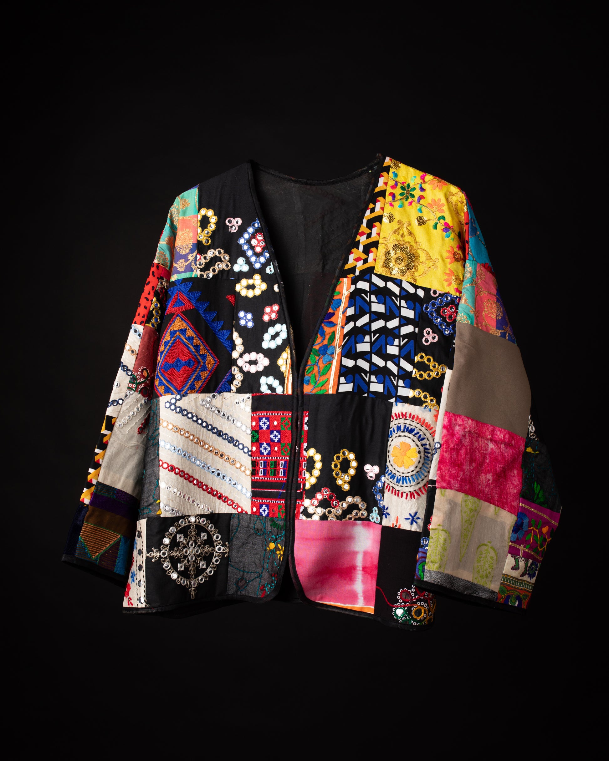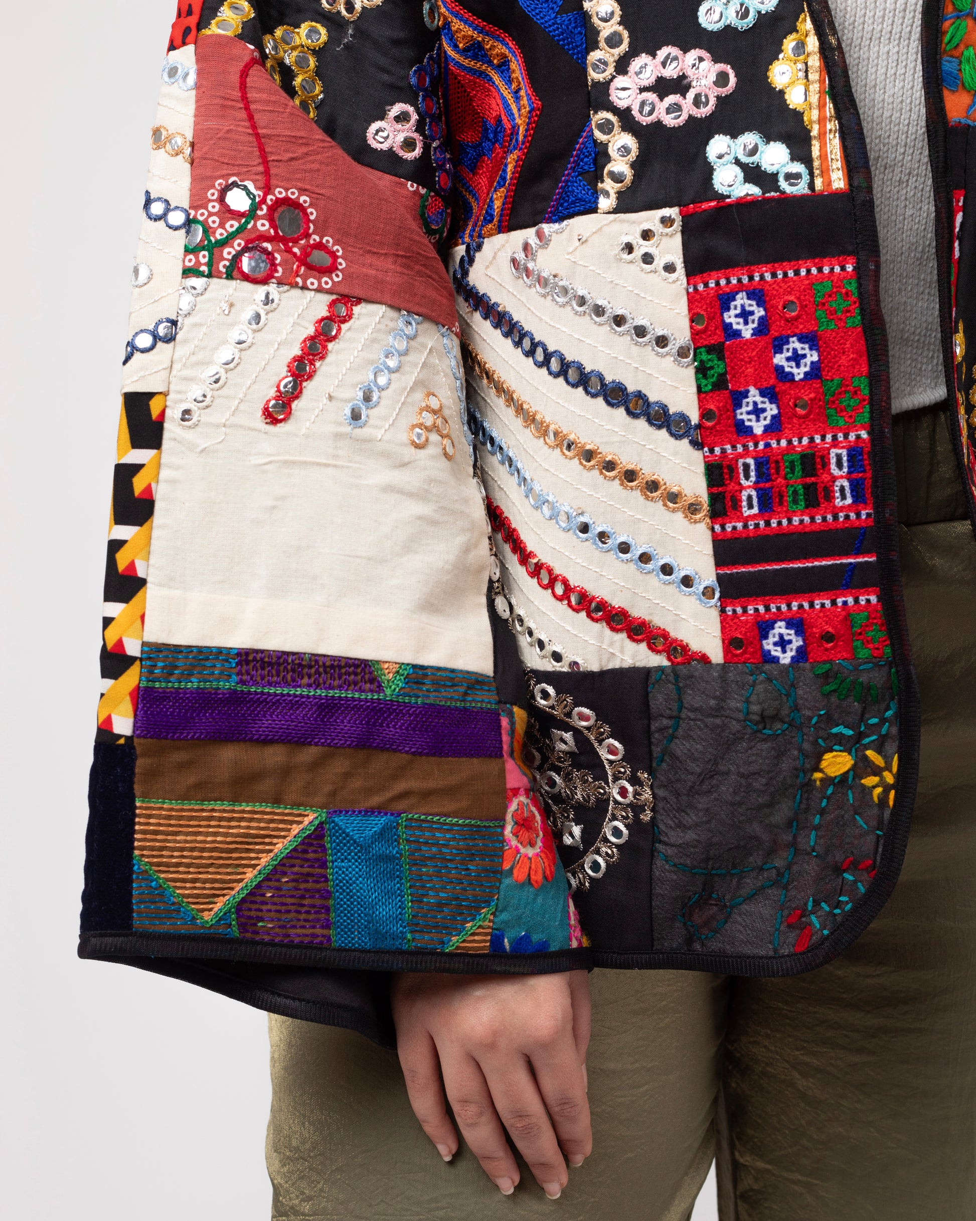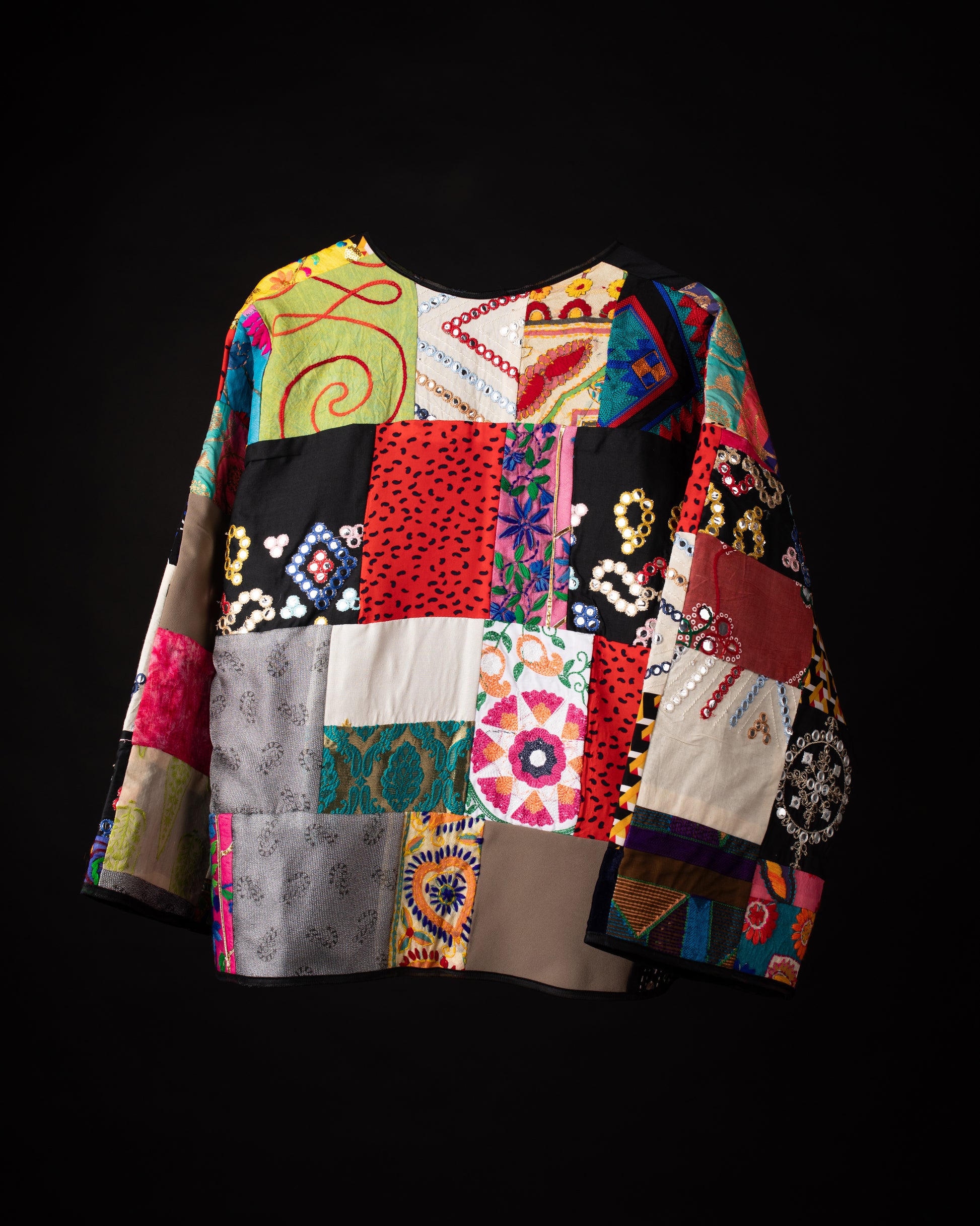 A mosaic of mirror-work, florals, symbols, and tribal geometry — Mehrbanoo is regal chaos made wearable. The bold patchwork speaks of stories stitched together through time, while the open cut keeps the silhouette airy and grounded.