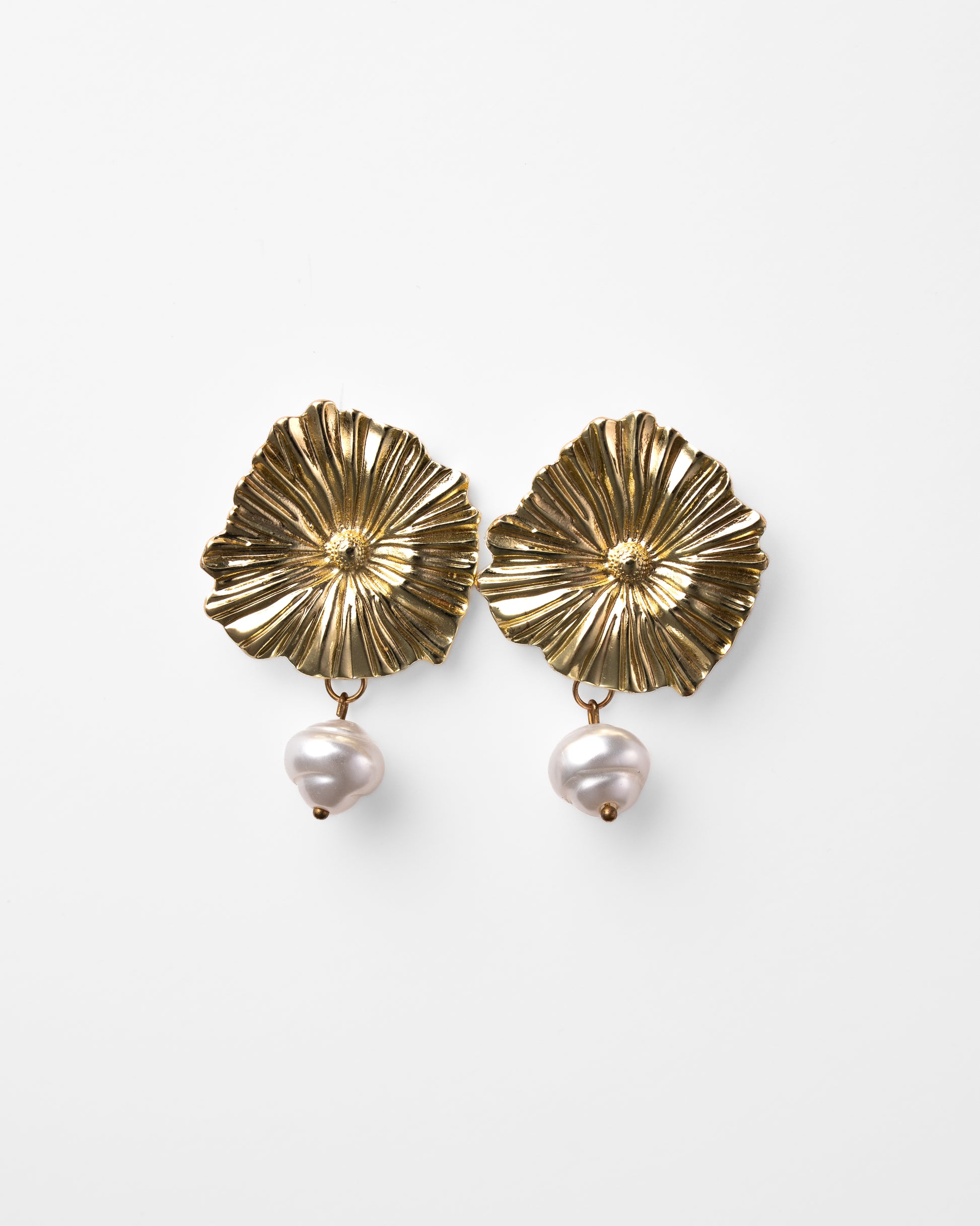 A delicate flower form in gold paired with a baroque-style pearl. These drop earrings bloom with elegance and add a radiant finish to your look.