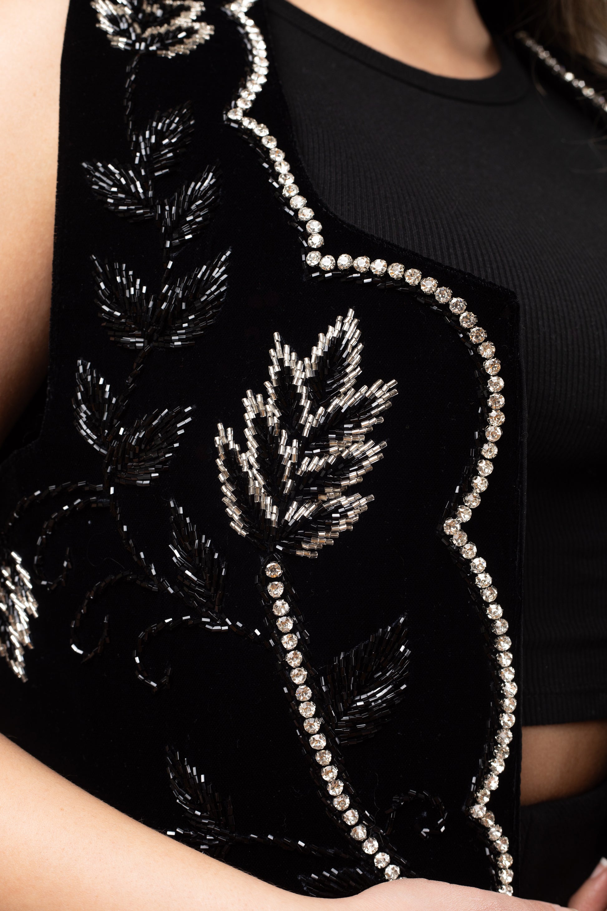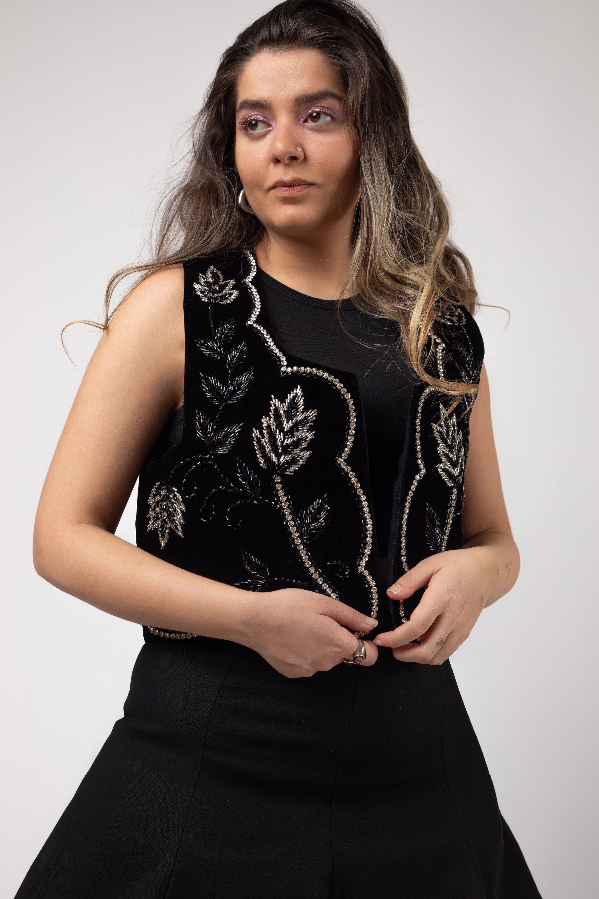 A vest characterized by its gracefully scalloped edges, outlined in silver beadwork and embellished with subtle leaf motifs. This piece evokes a sophisticated simplicity, reminiscent of vintage glamor.