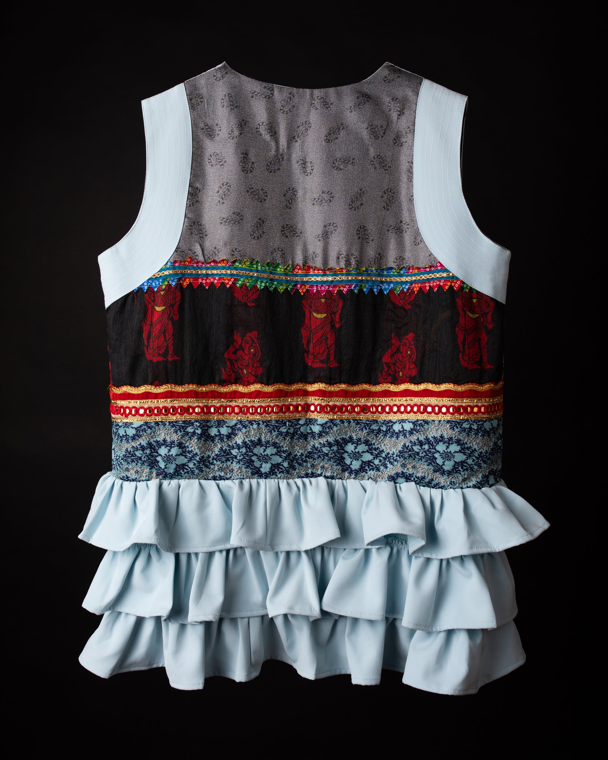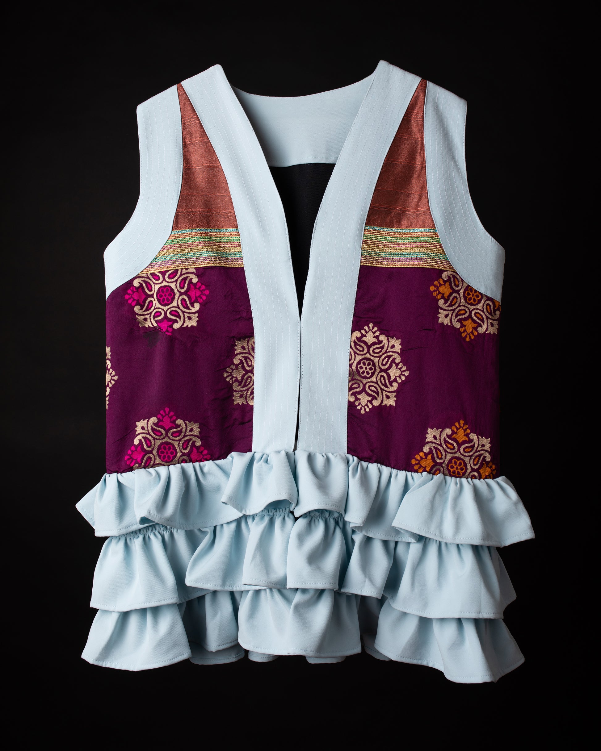 A symphony of silk and sky, the Sorud vest plays with contrast — plum tones against soft blue ruffles, echoing ceremonial Baluchi harmony.
