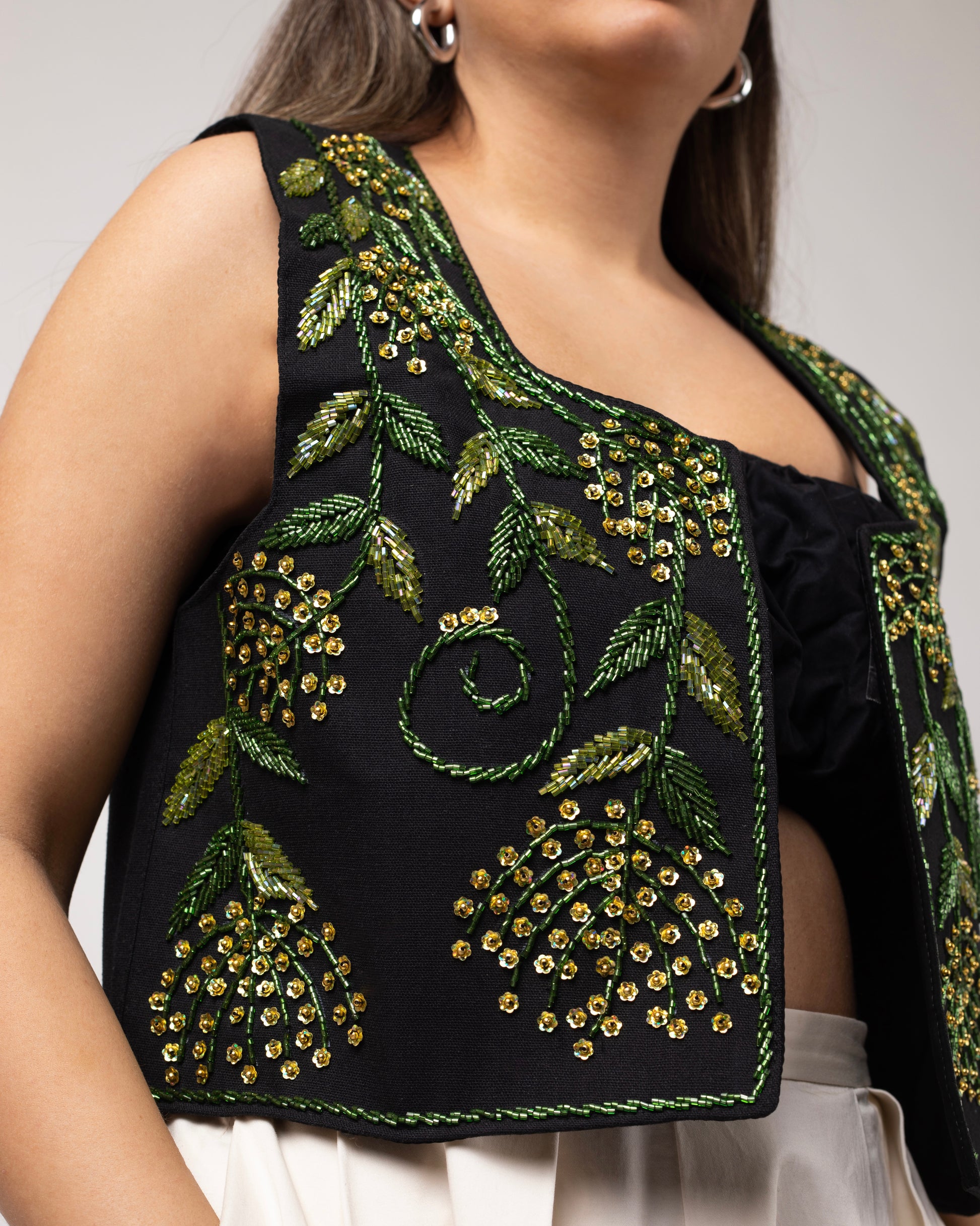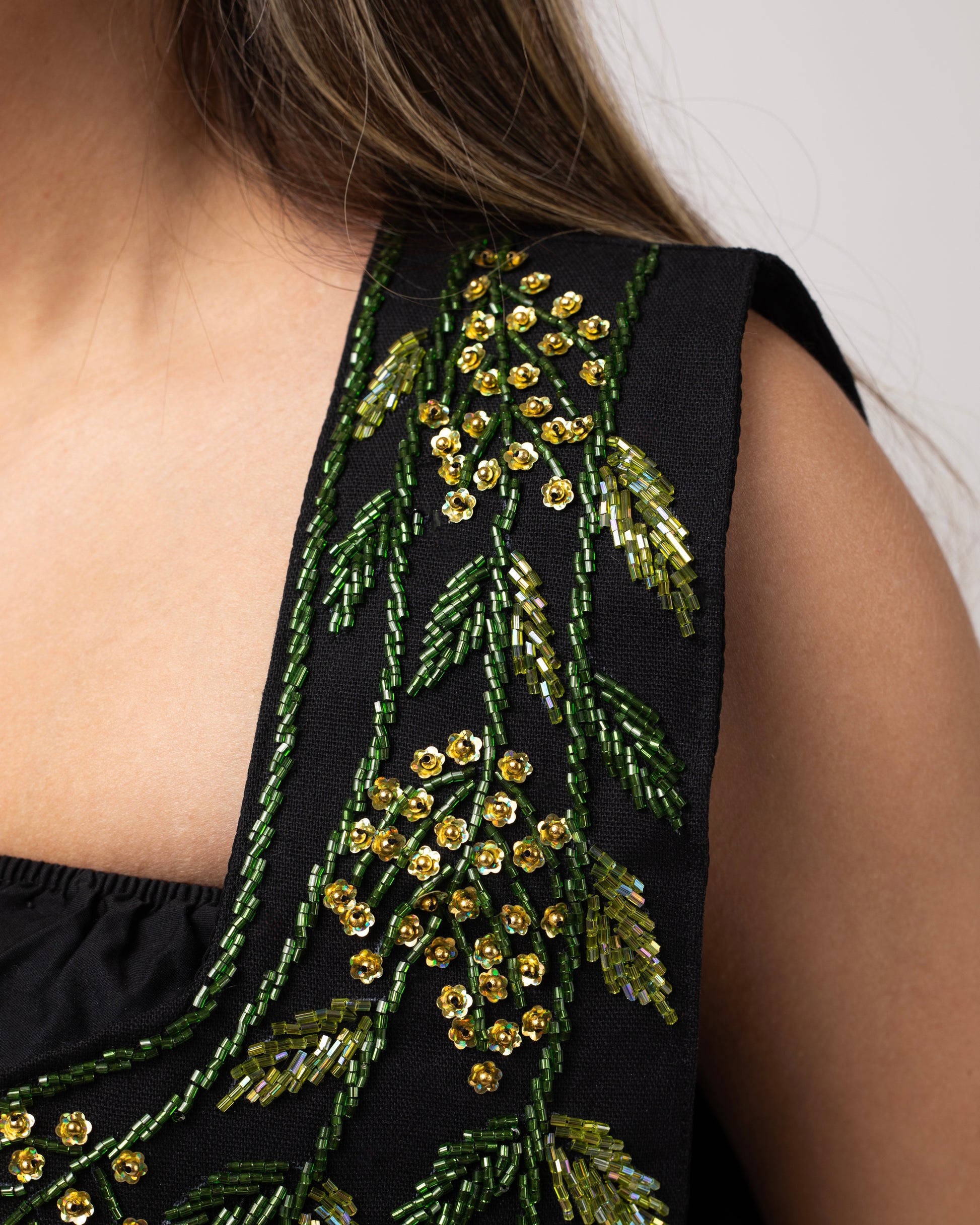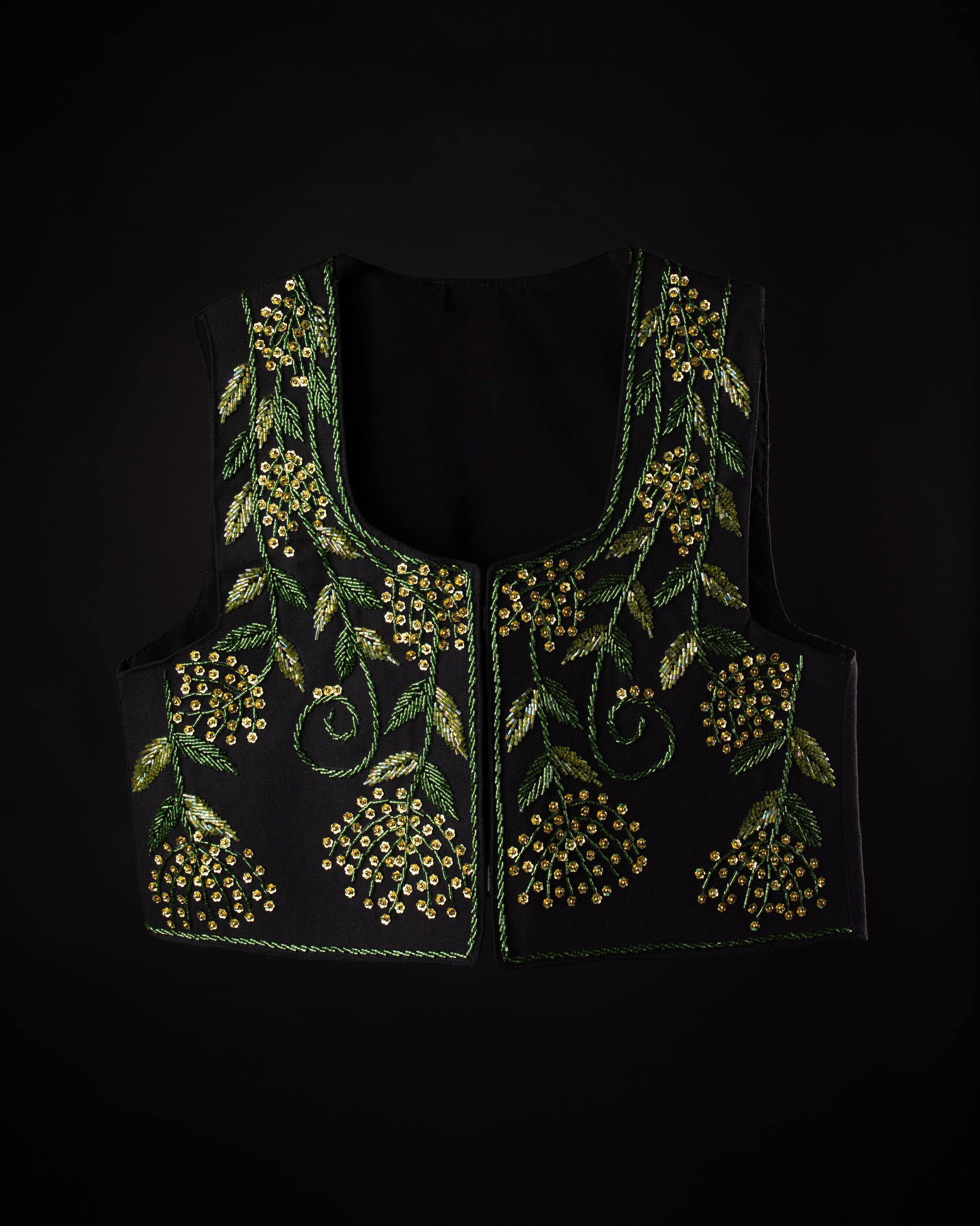 A lush depiction of cascading foliage, detailed with intricate gold and green beadwork resembling clusters of flowering vines. Nature's abundance is reflected in its luxurious texture and vibrant artistry.