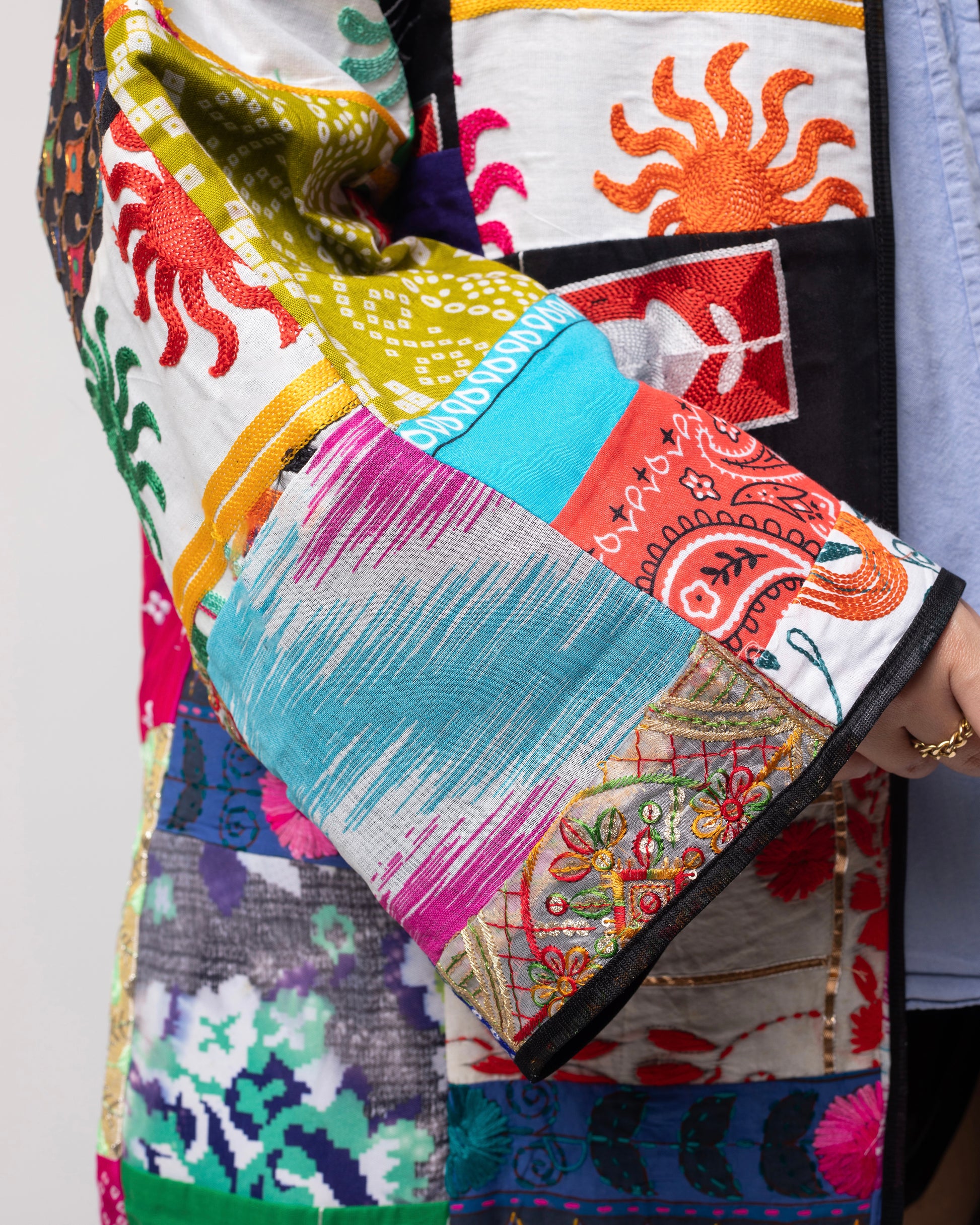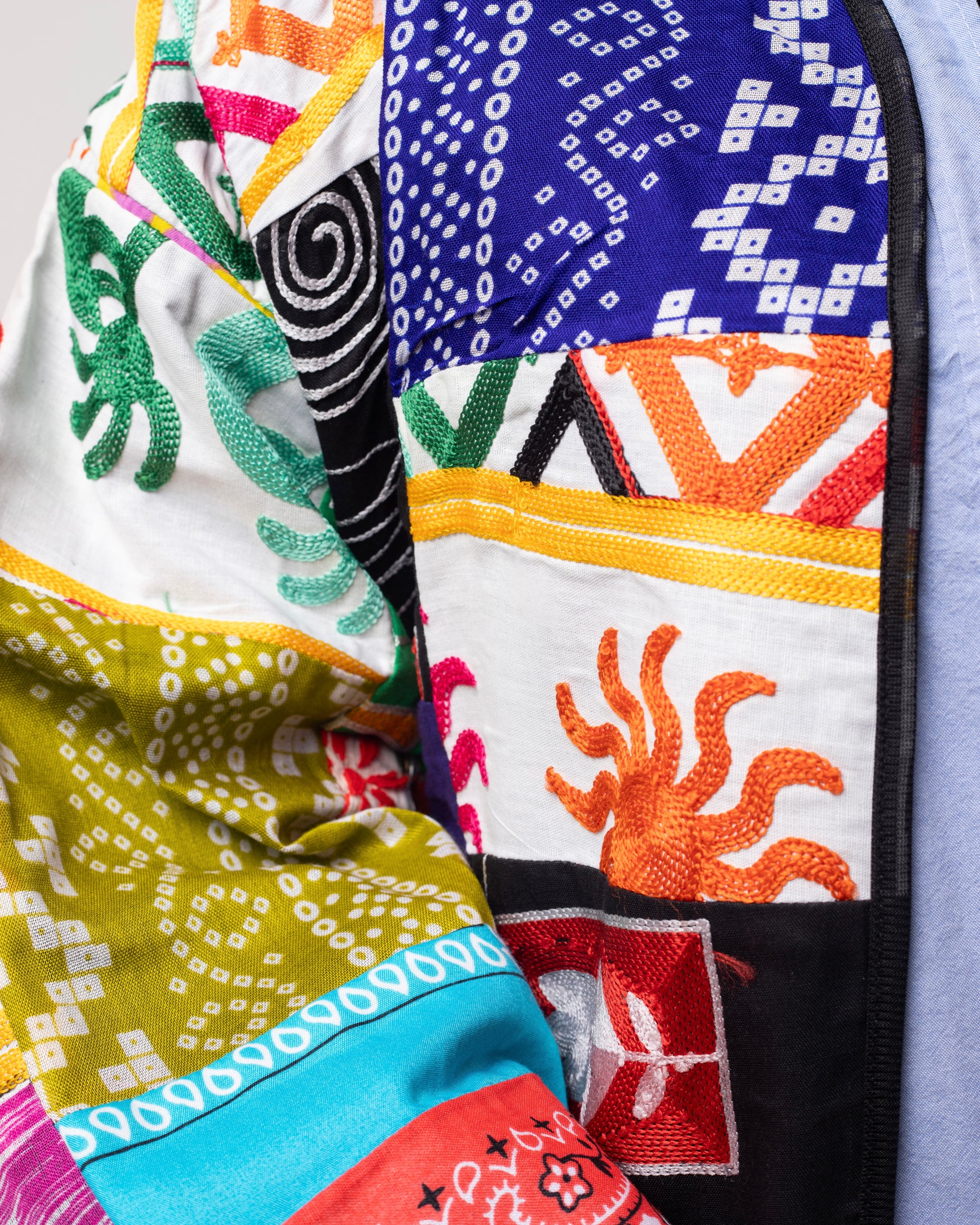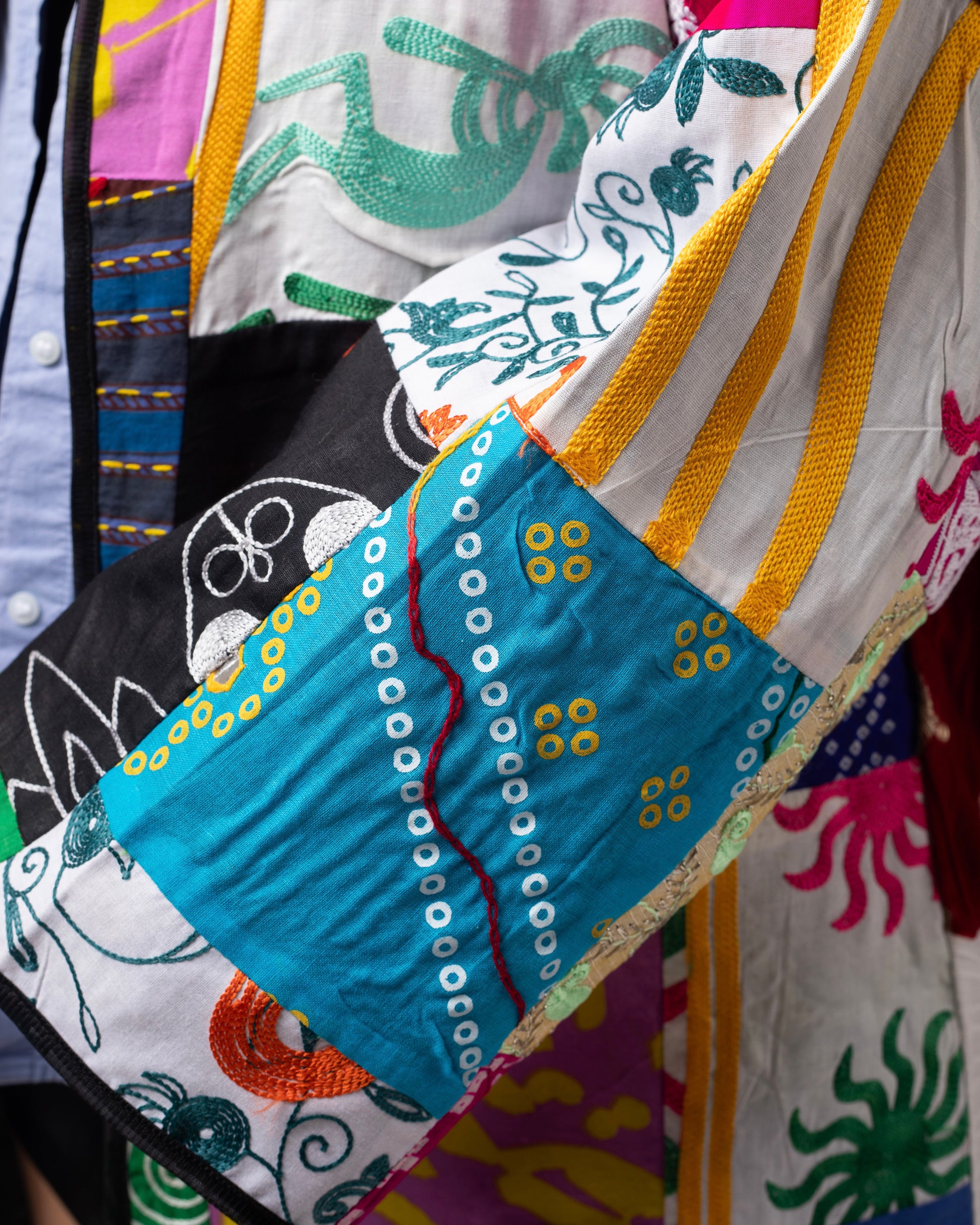 Cool, rhythmic, and mythical — Zhaleh carries drops of pattern like morning dew. It sings with stitched spirals and sun-flooded color.